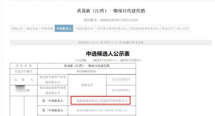 7月25日,重庆市公共资源交易网显示,“成都龙湖龙智造工程建设管理有限公司”成为黄葛渡(江湾)一期项目代建代销的第一中选候选人。